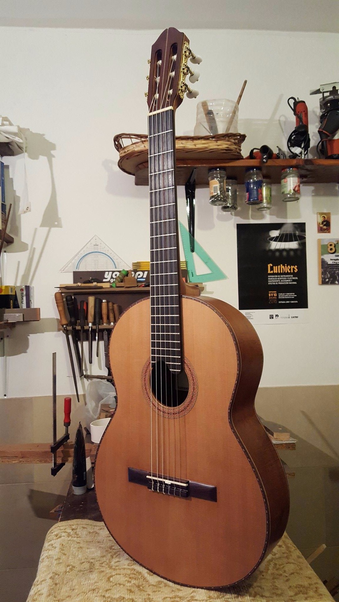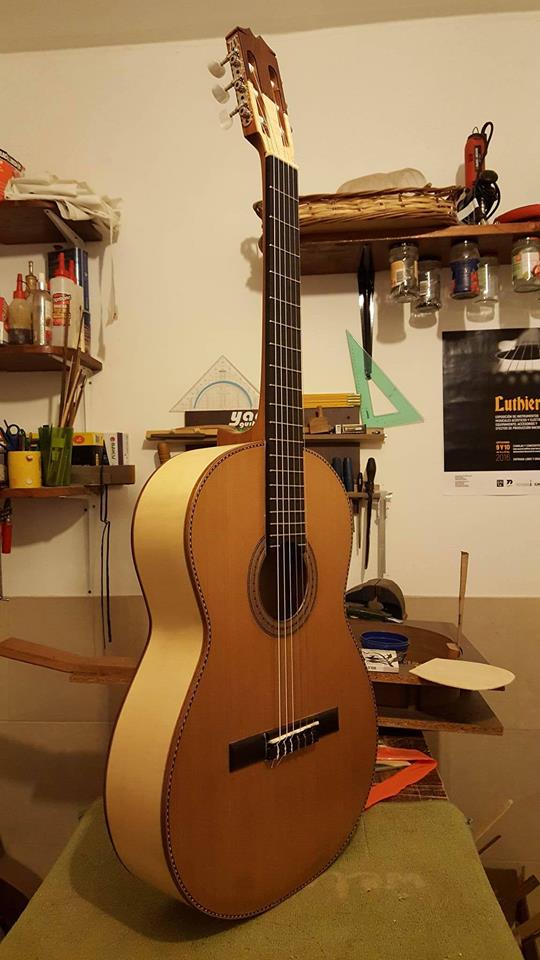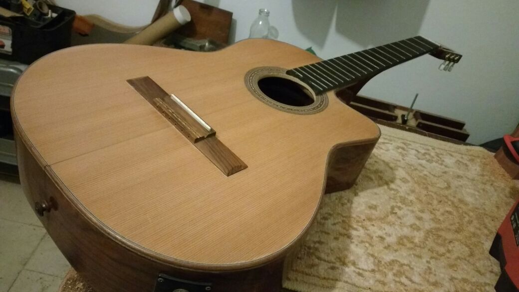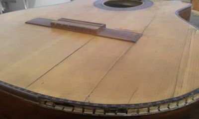 Tapa armónica de una guitarra marca "La Alpujarra" rasgada en varios lugares y despegada de los aros en la parte de abajo (la imagen de fondo muestra la misma luego del arreglo). Se le cambió la tapa armónica, para lo cual fue necesario despegar el diapasón, quitar la tapa dañada y desprenderle el puente. Se construyó una tapa nueva y se le pegó al cuerpo, después se le incrustaron las cenefas (adornos de los bordes que sirven, a su vez, de protección), se volvió a pegar el diapasón, el puente y, por último, se le dio varias manos de laca.