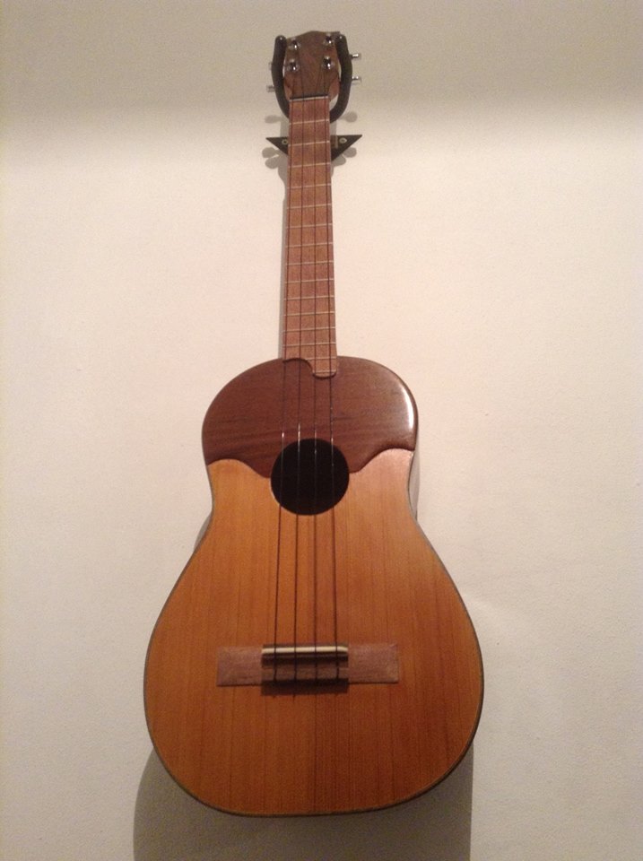 Fondo y aros de nogal., Tapa de Red Cedar. Diapasón de Algarrobo. Puente de Guayacán. Golpeador de Nogal. Clavijas Gotoh. Acabado a goma laca.